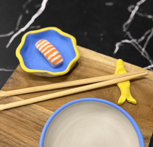 A guided sushi-making workshops with Roll This Way Chef and Painting Pottery Ceramic Sushi Set!